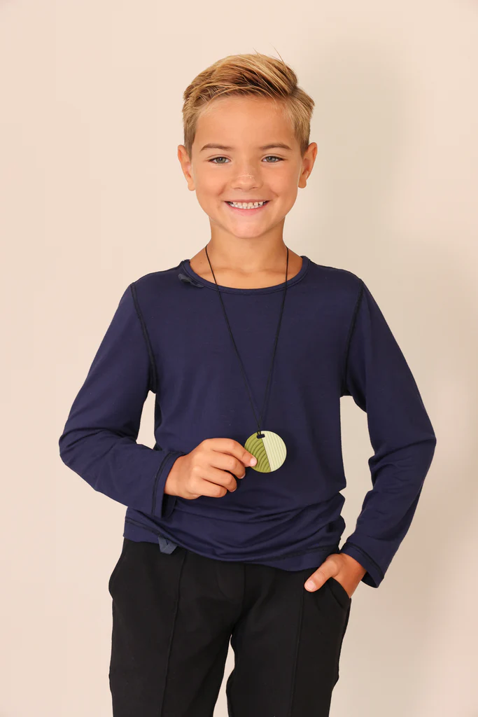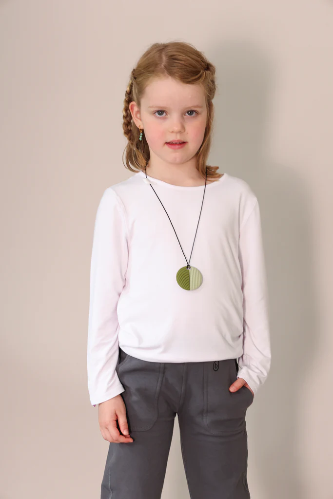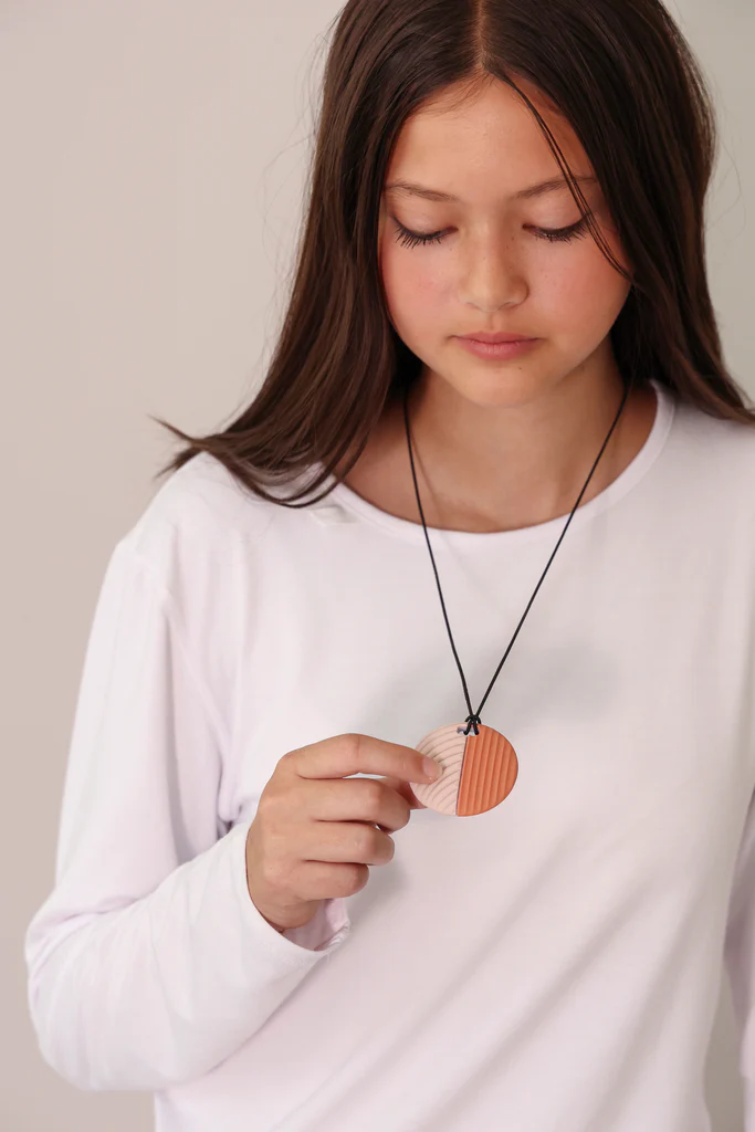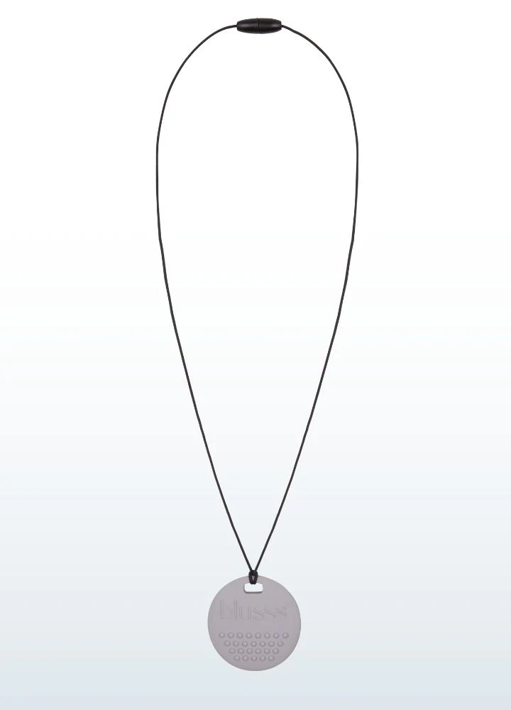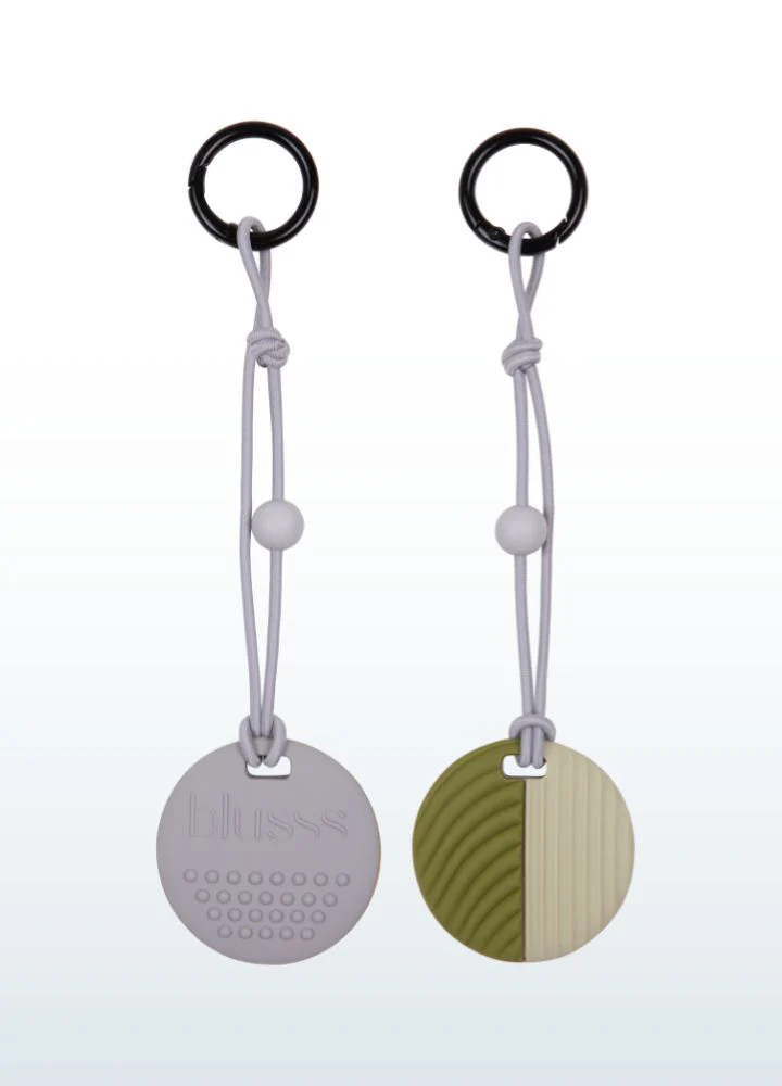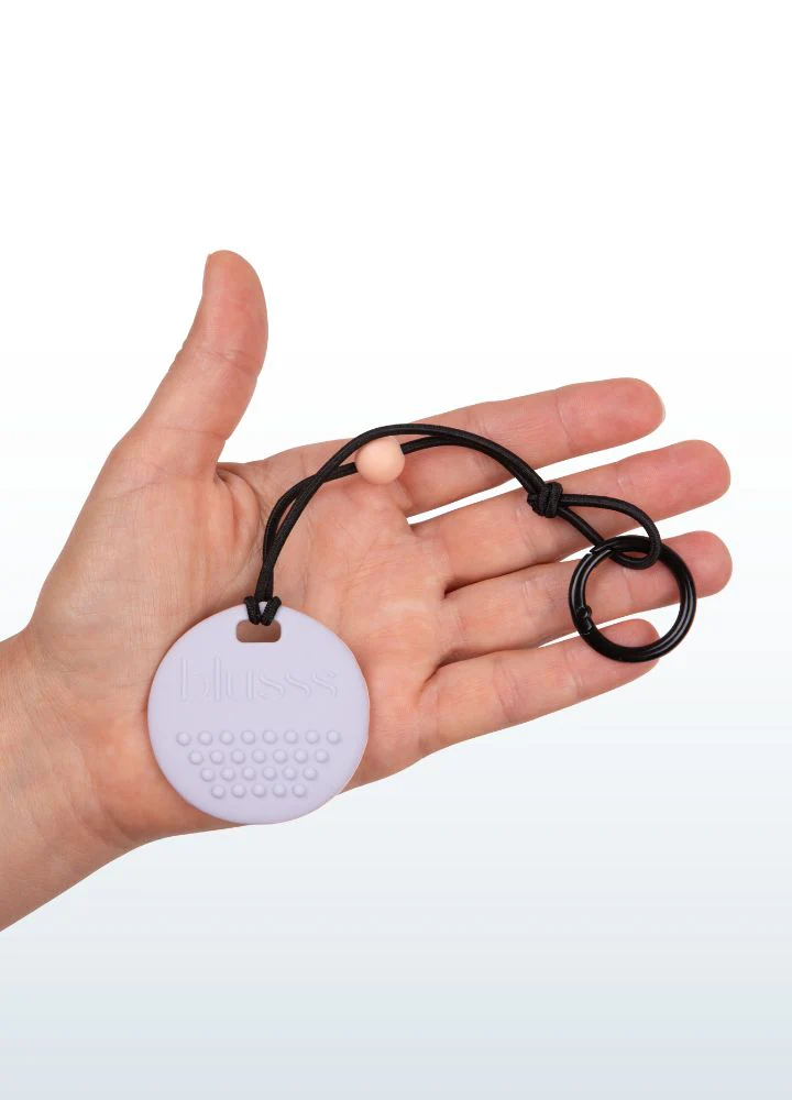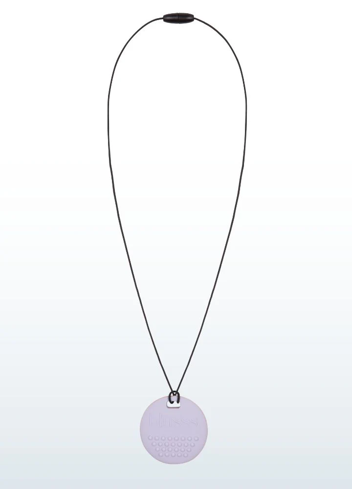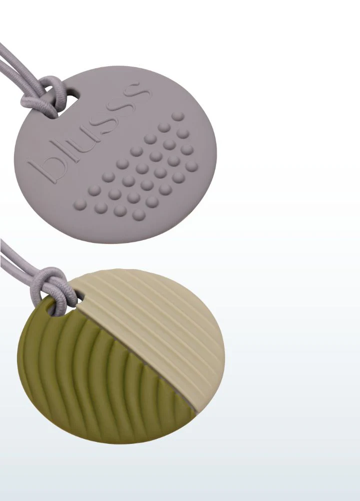 Dieser weiche Fidget aus 100 % sicherem Silikon kann gekaut oder mit den Fingern berührt werden. Die runde Form mit genoppter Vorderseite und geriffelter Rückseite bietet beruhigende taktile Reize. Einfach an einem Reißverschluss, einer Tasche oder einem Federmäppchen zu befestigen – oder als Halskette zu tragen. Immer griffbereit in stressigen Momenten.
