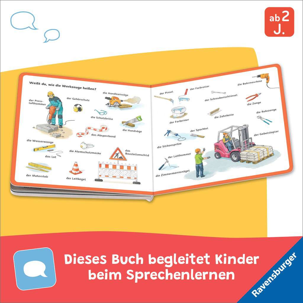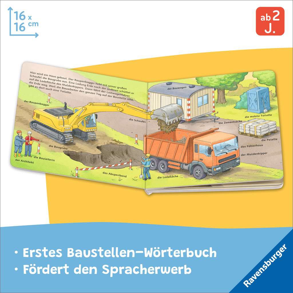 Der Bagger hebt die Baugrube aus und der Ladekran bringt Ziegelsteine für die Hauswände. Und was macht ein Zimmermann? In diesem Buch lernen Kinder ab 2 Jahren viele Fahrzeuge, Handwerkerinnen und Werkzeuge kennen und benennen. Kurze Texte beschreiben kindgerecht die unterschiedlichen Schritte und Aufgaben beim Hausbau. Alle Werkzeuge, Fahrzeuge und Berufe werden genau benannt. Das regt kleine Baustellen-Fans zum Sprechen an und fördert den Aufbau des Wortschatzes.