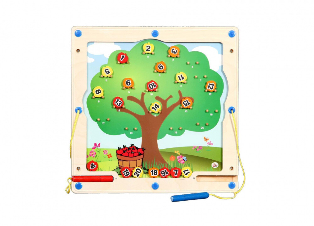 Diese Äpfel kann man zu jeder jahreszeit pflücken! Mit Hilfe von zwei magnetischen Stiften können die nummerierten Äpfel bewegt werden. Die Äpfel sollen dabei den zahlen auf dem Baum zugeordnet werden. Das Spiel besteht überwiegend aus Holz. Umgeben ist das Wandelement von einer durchsichtigen Umrandung aus Kunststoff. Mit einer Größe von 40 x 40 x 3 cm findet das Motorikspiel an vielen Zimmerwänden einen Platz, es kann aber auch auf einem Tisch aufgestellt werden.. Das Set umfasst außerdem zwei Standfüße und 20 magnetische Zahlenchips in Apfelform. Die Magnetstifte sind auf der linken und rechten Seiten durch eine Schnur am Rahmen des Motorikspiels fixiert. Das zentrale Element des Zuordnungsspiels stellt der farbenfroh gestaltete Apfelbaum dar.