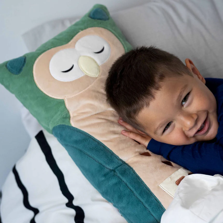 Das plüschige Eulenkissen mit zusätzlichem Fidget in Federform spendet Trost und hilft unruhigen Kindern sich auf eine erholsame Nachtruhe einzustimmen