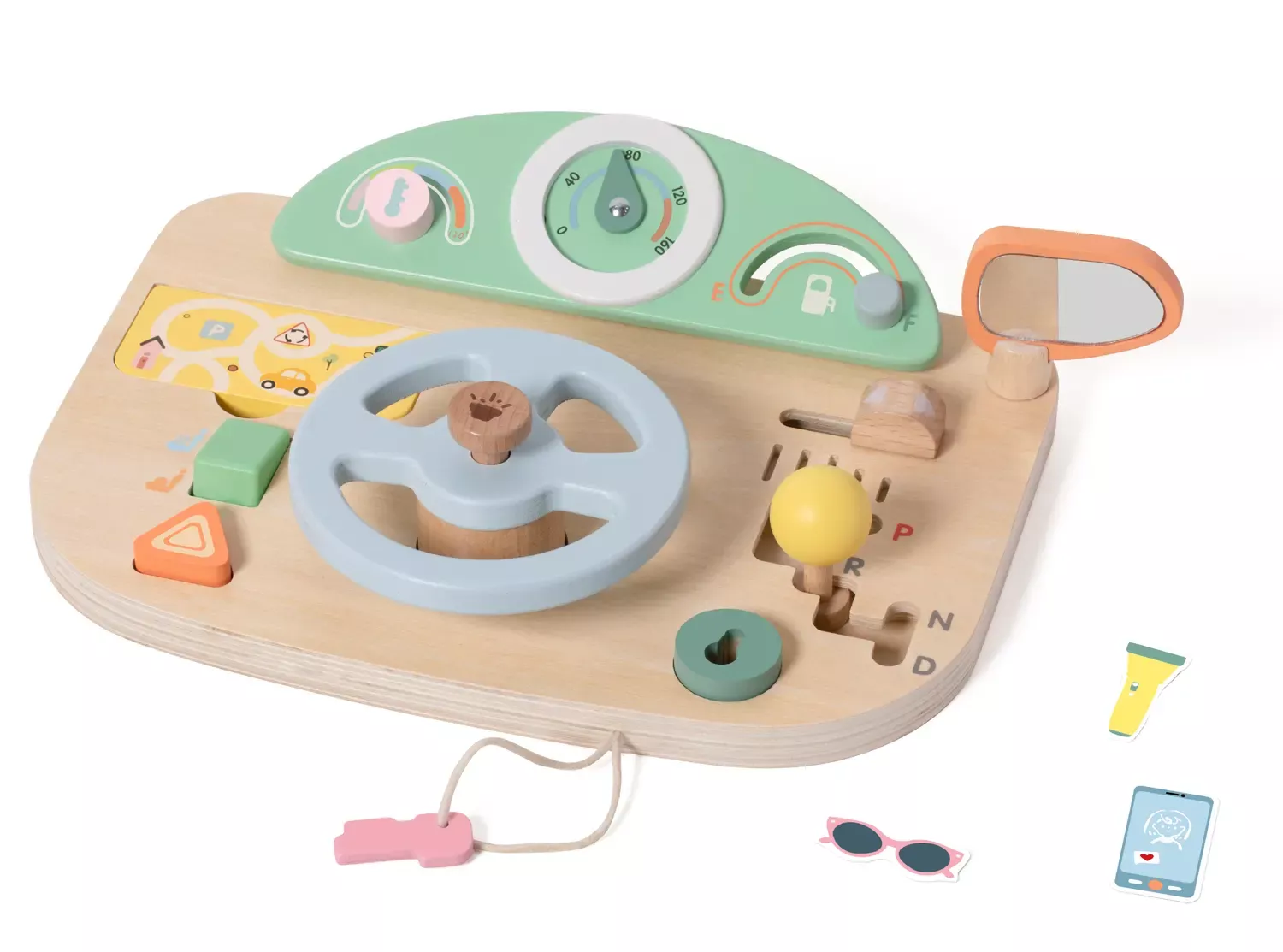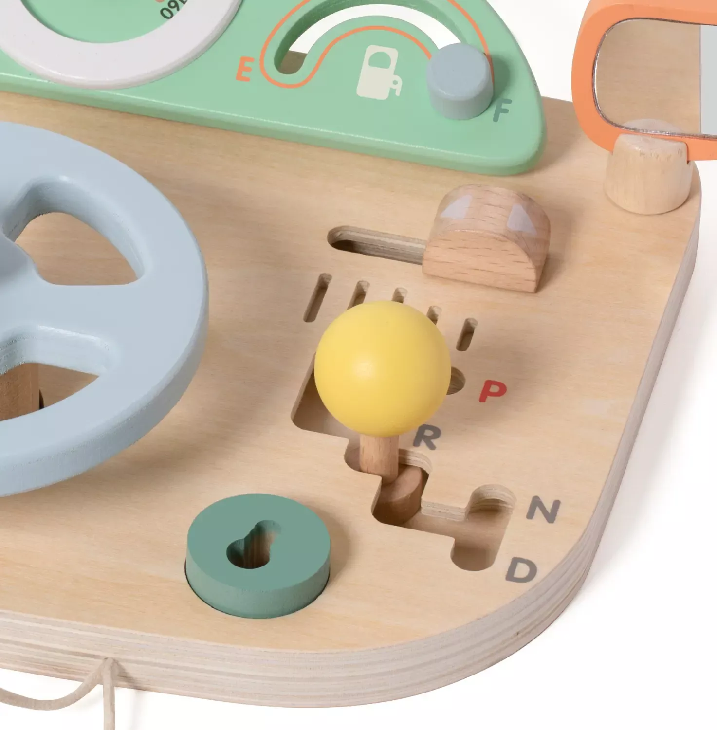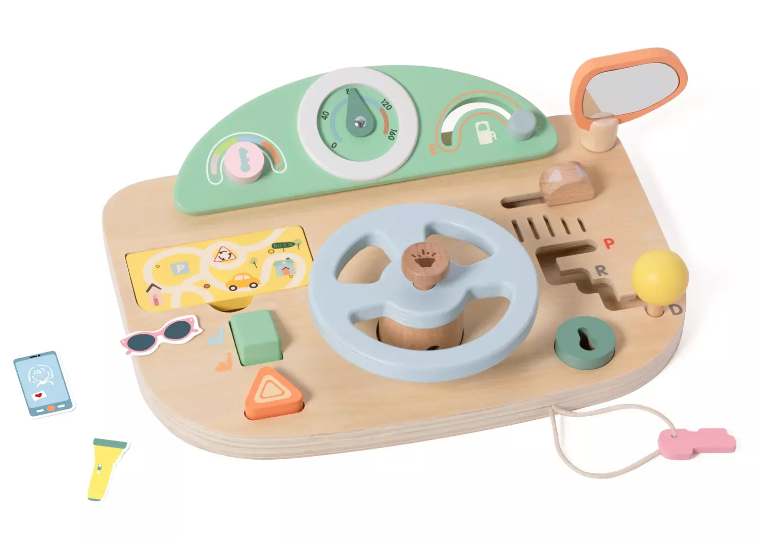 Hier setzt sich jedes Kind gern ans Steuer! Denn mit dem großen Cockpit aus Holz, dem drehbaren Lenkrad mit Geräuschen, Spiegel, Steuerknüppel, Tacho, diversen Knöpfen und vielem mehr kann die große Fahrt beginnen! Das spannende Aktivitäten-Brett regt die Phantasie an und fördert die Feinmotorik.