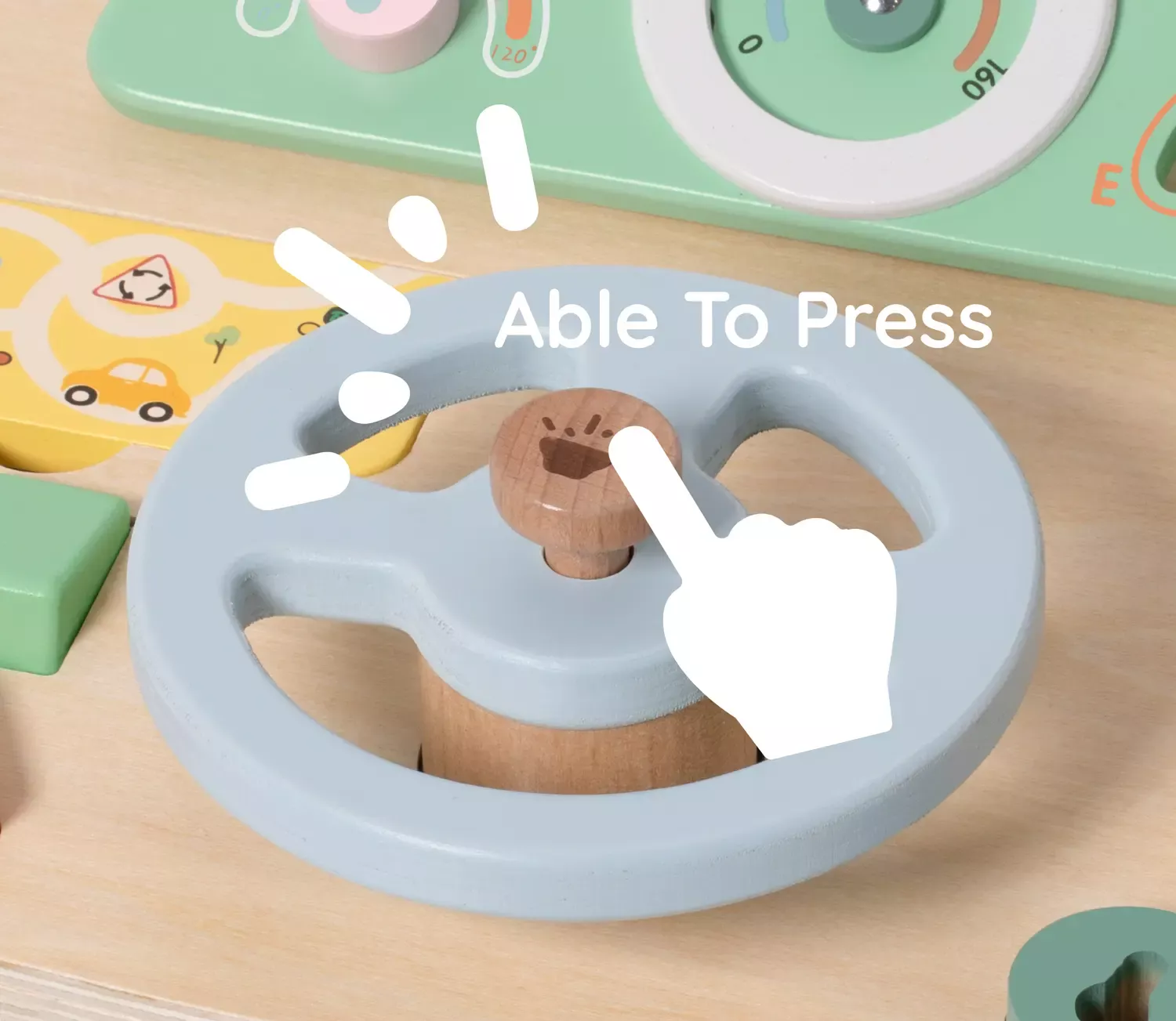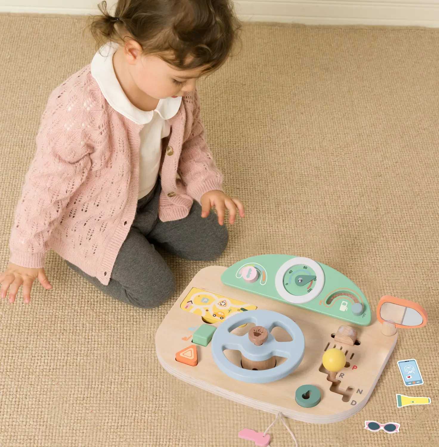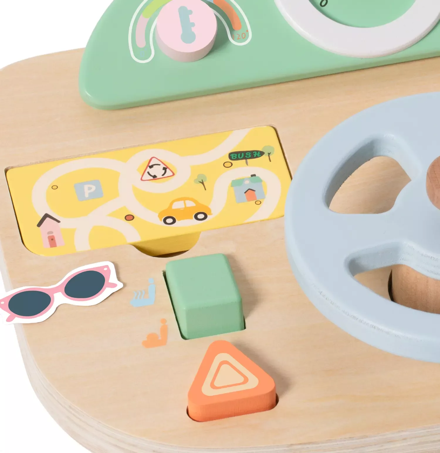 Hier setzt sich jedes Kind gern ans Steuer! Denn mit dem großen Cockpit aus Holz, dem drehbaren Lenkrad mit Geräuschen, Spiegel, Steuerknüppel, Tacho, diversen Knöpfen und vielem mehr kann die große Fahrt beginnen! Das spannende Aktivitäten-Brett regt die Phantasie an und fördert die Feinmotorik.