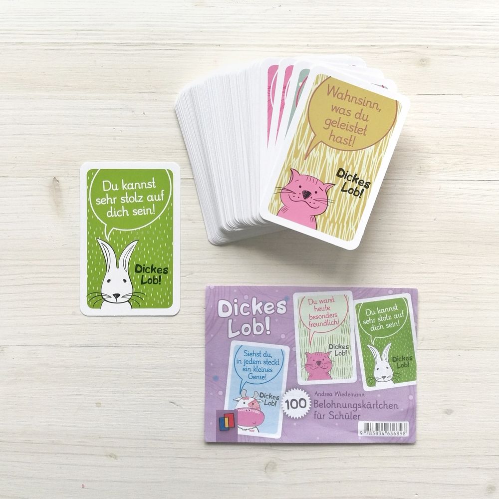 Jedes Fleißkärtchen schließt mit der klaren Anerkennung: „Dickes Lob!“. Mit 25 verschiedenen „freundlichen Worten“ – jeweils in 4-facher Ausfertigung – entfachen Sie so ganz einfach das Sammelfieber, motivieren Sie kindgerecht und haben für jede Situation das passende Lob an der Hand.