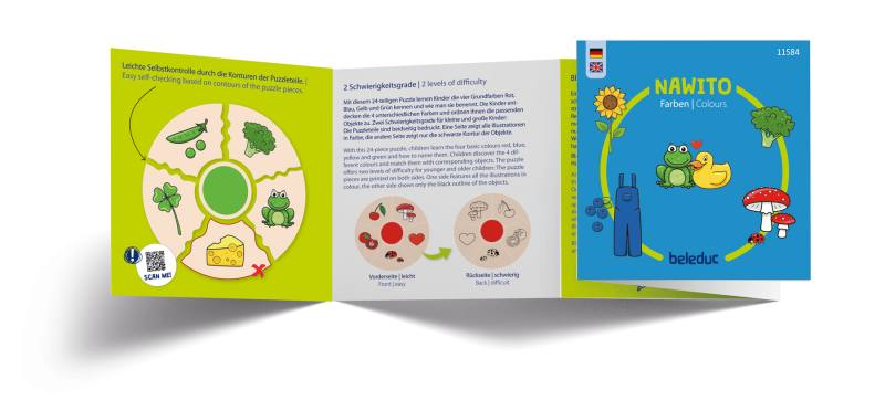 - 2 Schwierigkeitsstufen: Vorderseite: Objekte in Farbe / Rückseite: Objekte mit schwarzer Kontur