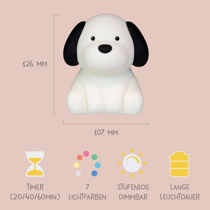 Das niedliche Nachtlicht aus weichem Silikon spendet besonders warmes Licht mit reduziertem Blauanteil. Denn blaues Licht kann die Produktion von Melatonin hemmen – dem Hormon, das unseren natürlichen Schlafrhythmus unterstützt. Zusätzlich können sieben RGB-Farben ausgewählt werden, die für Abwechslung und Wohlfühlatmosphäre sorgen. Die stufenlose Dimmung ermöglicht es, die Helligkeit individuell anzupassen – ganz nach Bedarf. Der integrierte Sleep-Timer schaltet das Licht automatisch nach 20, 40 oder 60 Minuten aus. Mit einer Akkulaufzeit von bis zu 200 Stunden im gedimmten Modus und USB-C-Ladefunktion ist das Nachtlicht besonders alltagstauglich. Ob Zuhause oder unterwegs – dieses LED Nachtlicht schafft eine ruhige Umgebung für Babys, Kinder und Erwachsene.