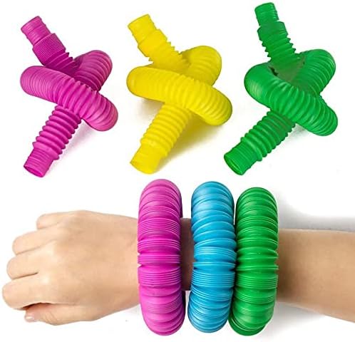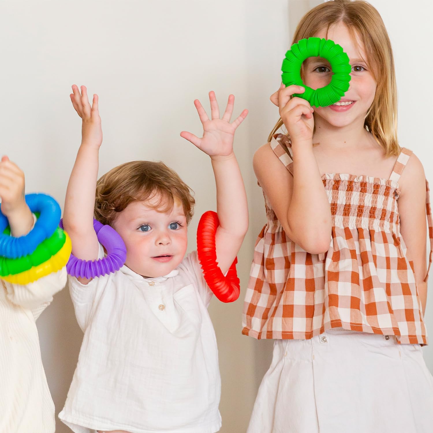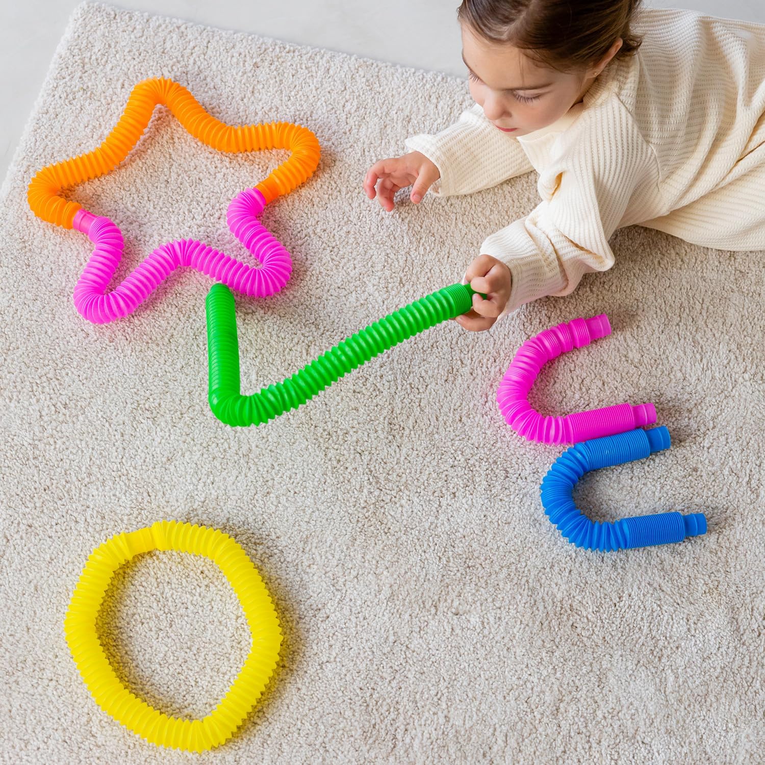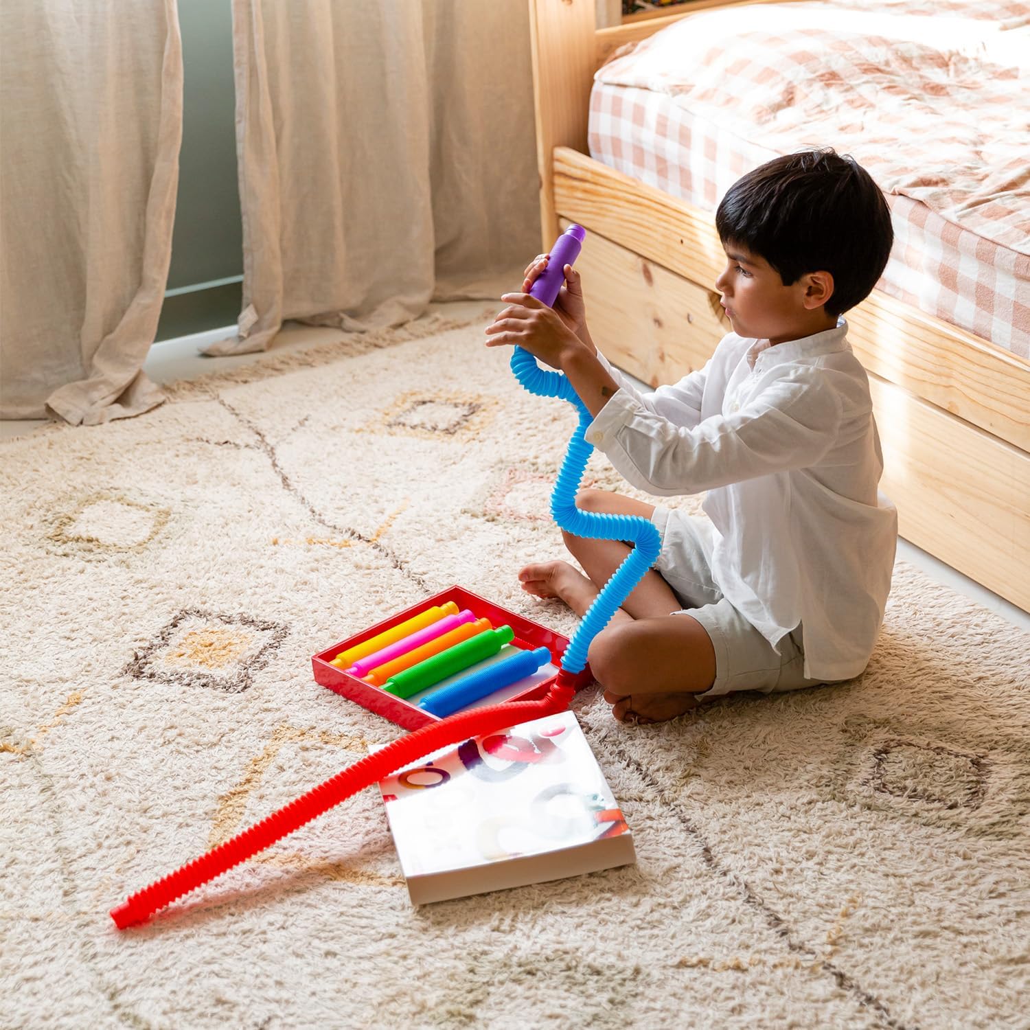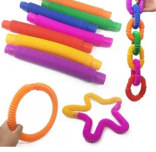 Die farbenfrohen Röhren lasssen sich mitienander verbinden. So entrstehen bunte Schläuche, große Kreise oder phantsievolle Formen aller Art. Und ganz nebenbei entstehen durch das Auf- und Ineinanderschieben der Schläuche lustige Geräusche.