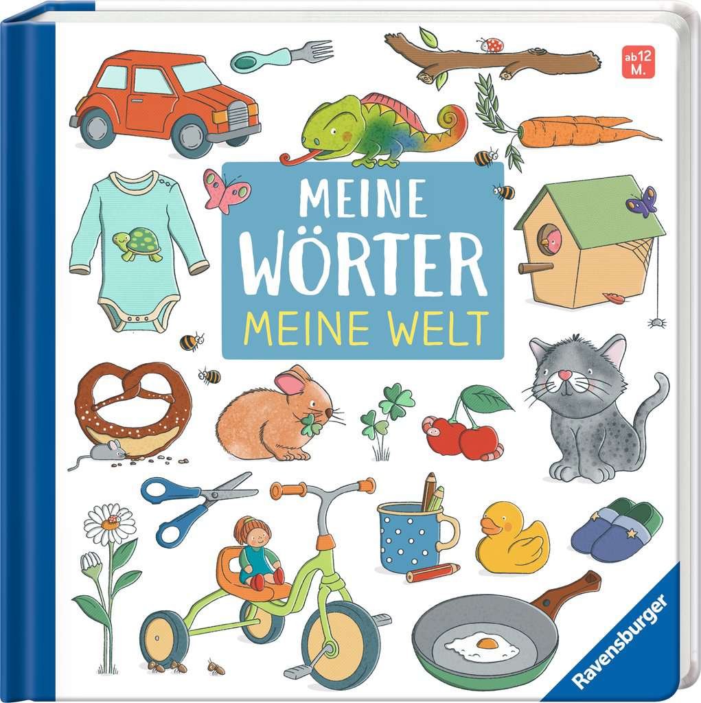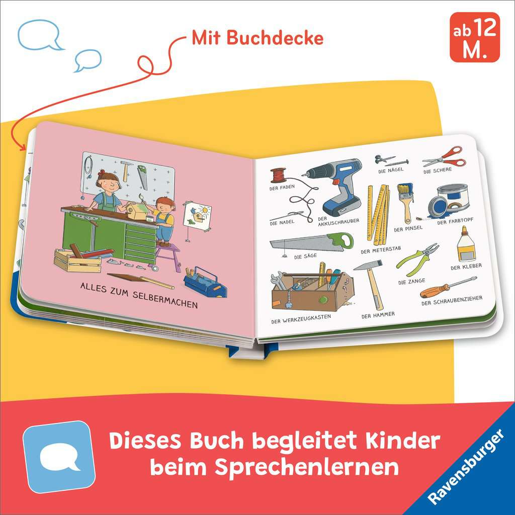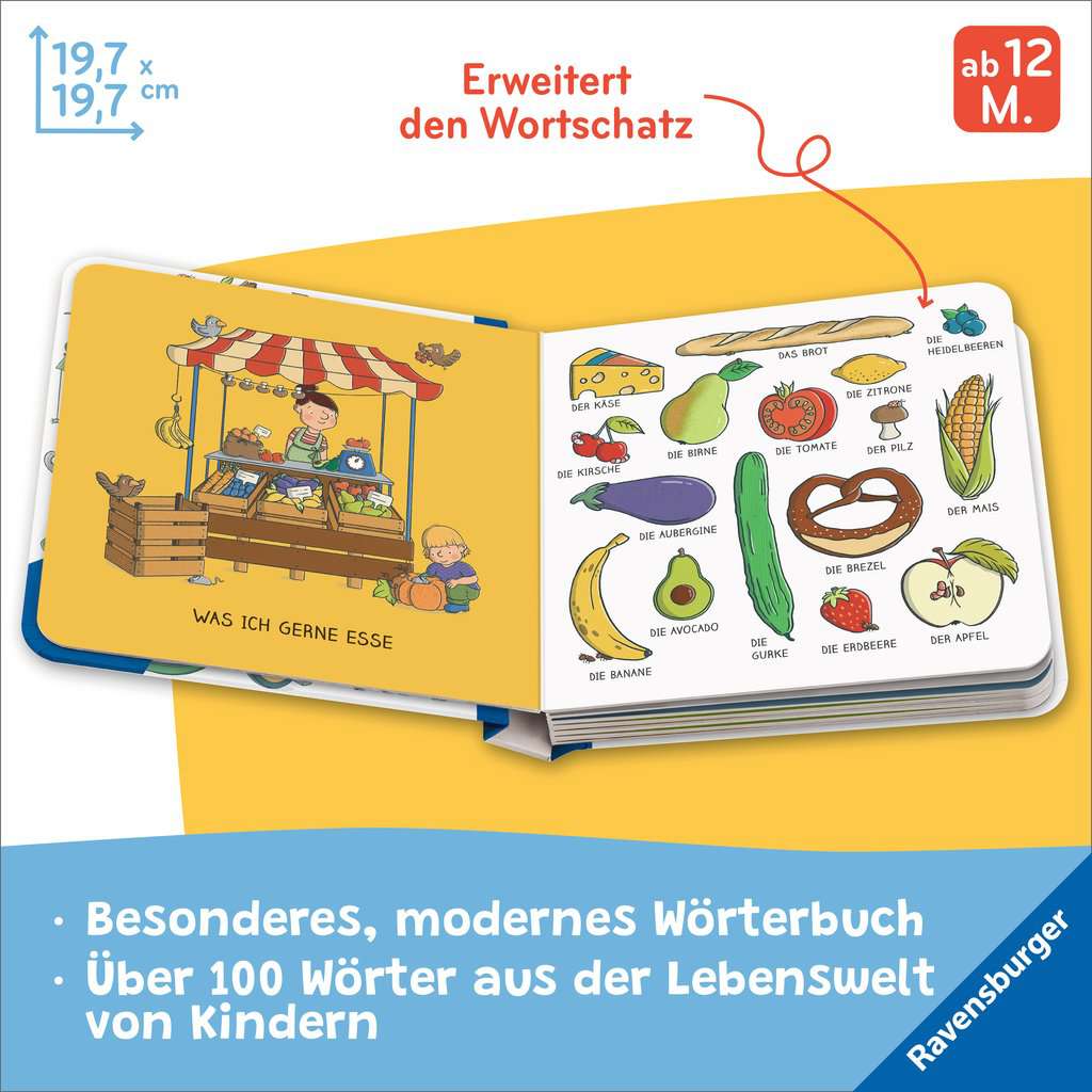 Komm mit in die bunte Welt der Wörter! Kinder entdecken ihre Umgebung und die Welt der Wörter auf ihre ganz eigene Weise. Manche erforschen lange und sprechen kein Wort. Andere plappern alles nach – lange bevor sie wissen, was das Wort eigentlich bedeutet. Welchen Weg ein Kind auch geht – alle verbindet ein Ziel: Sprechen lernen! Dieses besondere Wörterbuch unterstützt Kleinkinder ab 1 Jahr auf diesem Weg. Die einzeln benannten Motive orientieren sich an der Lebenswelt der Kleinsten und erleichtern damit das Erkennen und Benennen. Wie heißt das Ding, mit dem man über die Zähne rubbelt? Frisst der Hund eigentlich auch aus einem Teller? Und was ist das für ein kitzliger, bunter Stoff auf meinem Kopf? Wir Erwachsenen wissen natürlich, wie die Dinge heißen. Kinder müssen die Welt unserer Sprache erst erforschen. Dieses Wörterbuch mit über 100 Wörtern aus dem Alltag und der Umgebung von Kleinkindern (wie „Zahnbürste“, „Futternapf“ und „Mütze“) hilft ihnen dabei. Der Wechsel zwischen kleinen Szenen und Einzelmotiven erleichtert Kleinkindern das Erkennen. Die wimmelig ästhetische Anordnung der Bilder und der moderne grafische Illustrationsstil gefallen auch den Erwachsenen – so macht das gemeinsame Anschauen noch mehr Spaß. Der wattierte Umschlag fühlt sich dabei angenehm weich an und macht dieses Buch auch haptisch zu einem ganz besonderen Erlebnis.