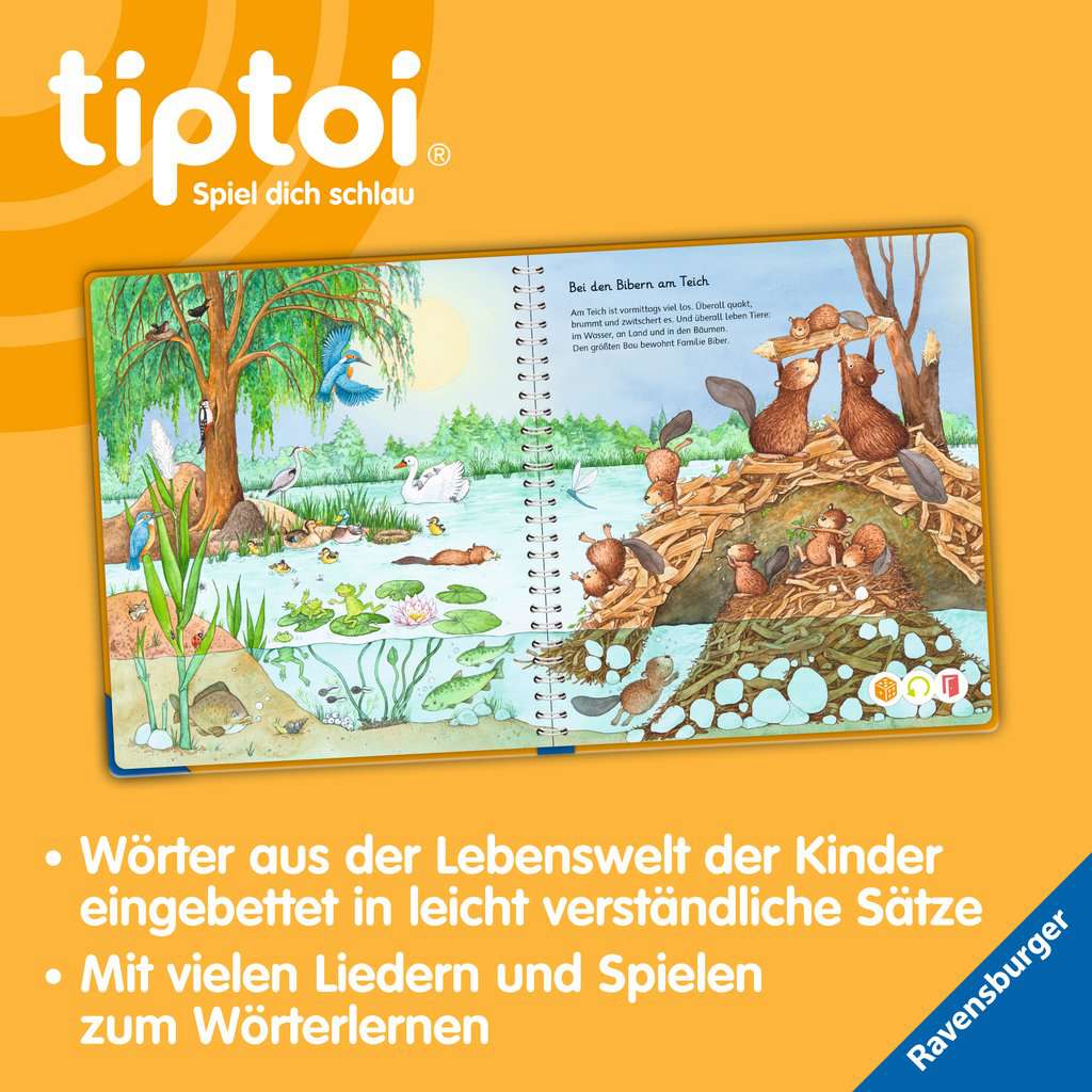 Mit diesem Buch entdecken Kinder sechs verschiedene Lebensräume mit ihren jeweiligen tierischen Bewohnern. Ob im heimischen Wald oder am Nordpol - zahlreiche Geräusche und altersgerechte Erzähltexte machen die Tierwelt lebendig. Die Kinder erweitern beim Entdecken und Spielen ihren Wortschatz und verinnerlichen erste grammatische Strukturen. Mit der Reihe tiptoi Mein Wörter-Bilderbuch bauen Kinder spielerisch ihren Wortschatz auf und erweitern diesen selbstständig. Die kurzen, leicht verständlichen Texte eignen sich ideal für Kinder ab 3 Jahren. Das Buch zeigt den Kindern bekannte Szenen und Situationen und vermittelt viele vertraute Begriffe aus dem direkten Umfeld und der Erfahrungswelt der Kinder. Überall gibt es spannende Sätze, zahlreiche Dialoge und lustige Geräusche zu entdecken. Dabei sind die einzelnen Begriffe in ganze Sätze eingebunden, um den Kindern erste grammatische Strukturen zu vermitteln. Das Gelernte wird durch kindgerechte und abwechslungsreiche Spiele mit Lösungskontrolle abgefragt und vertieft. Neukomponierte Lieder und liebevolle Geschichten motivieren zum spielerischen Wörterlernen. tiptoi-Stift nicht enthalten. Muss separat erworben werden.