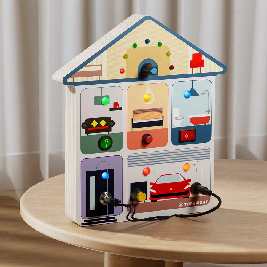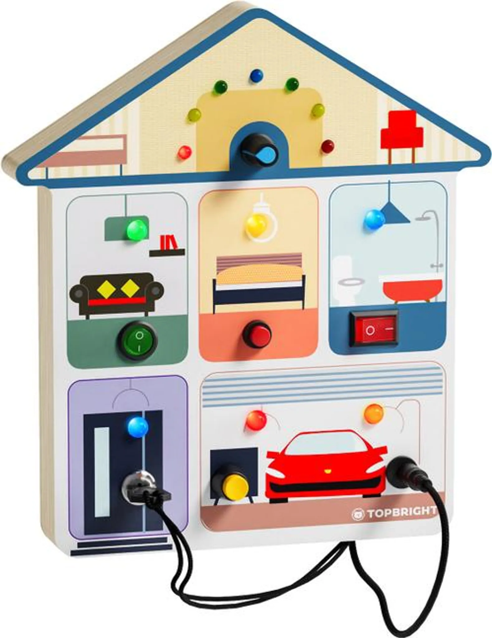 Busy Board Haus mit Wippschalter, Druckknopf, Drehschalter, Druckschalter, Schlüsselschalter und Kabelschalter