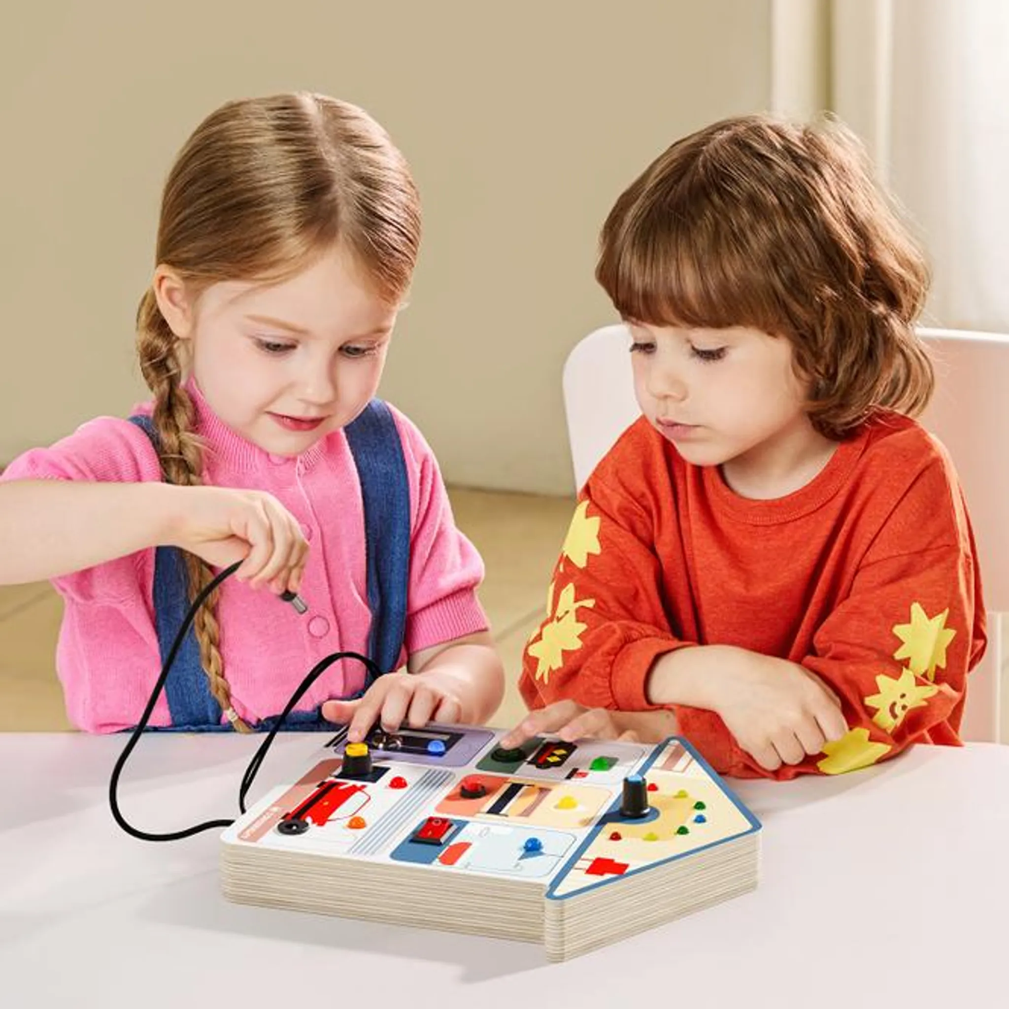 Drücken, Drehen und Kippen – das kleine Haus ist mit den verschiedensten Lichtschaltern wie im wirklichen Leben ausgestattet! Mit jedem Schalter wird ein anderes Zimmer im Haus beleuchtet. Doch der Schlüsselschalter ist der Hauptschalter. Sobald der Schlüssel gedreht wird, erwacht das Board zum Leben und den Kindern geht im wahrsten Sinne des Wortes ein Licht auf. Beim Spielen entdecken Kinder das Grundprinzip von Elektrizität und trainieren spielerisch ihre Feinmotorik. Das Busy Schalter-Haus ist ein hervorragendes Hilfsmittel, um auf spielerische und sichere Weise Neugier und Problemlösungsfähigkeiten zu fördern.