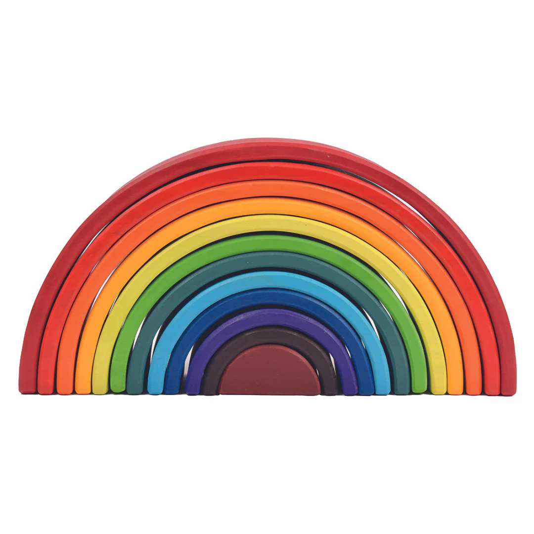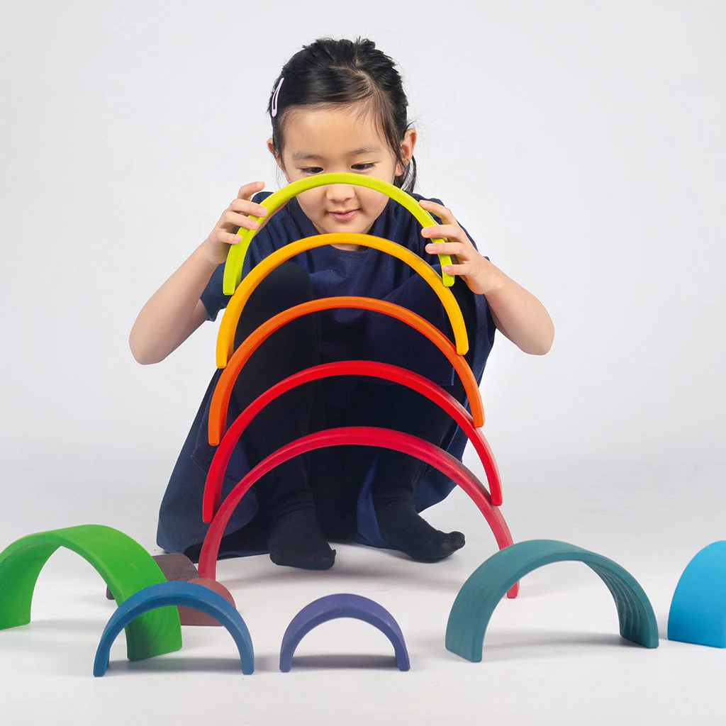 Mit diesem hochwertigen Set lässt sich wunderbar bauen und spielen! Die 12 Teile in den Regenbogenfarben sind aus massivem Holz und passen ineniander. Sie können gestapelt, nach Farben und Größen sortiert oder auch als Tunnel und Brücken zusammen mit anderen Arten von Bausteinen im kreativen Spiel verwendet werden. Fördert Farblehre, Kreativität und Motorik.