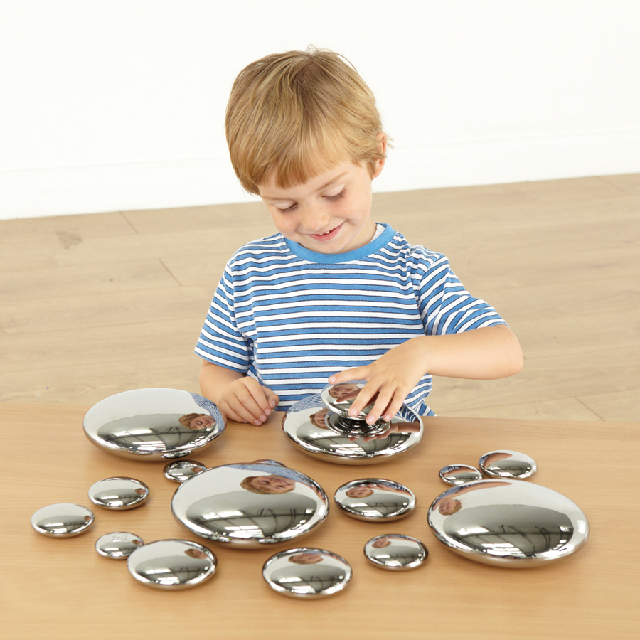 Die wunderschöne große Collection besteht aus 20 flachen, spiegelnden Kieselsteinen in vier verschiedenen Größen. (Nicht nur) jedes Kind ist von diesen hochpolierten Steinen begeistert! Die unregelmäßige Form ermutigt Kinder, die Steine aufeinander zu stapeln, sie nach Größe und Gewicht zu unterscheiden und kleine Türme zu errichten. Durch ihre besondere ästhetische Qualität sind die Steine ein echter Schatz in jeder Spielesammlung und ein Sinnes-Erlebnis besonderer Art. Größe der Kieselsteine zwischen 45 und 150 mm. Die kleine Colection besteht aus 4 Kieseln in den Größen zwischen 45 cm und 15 cm.