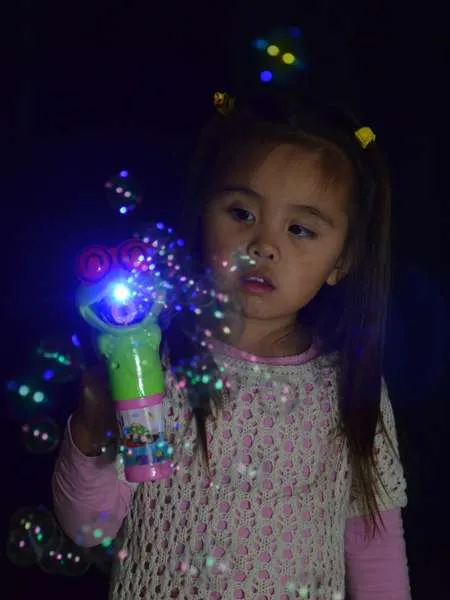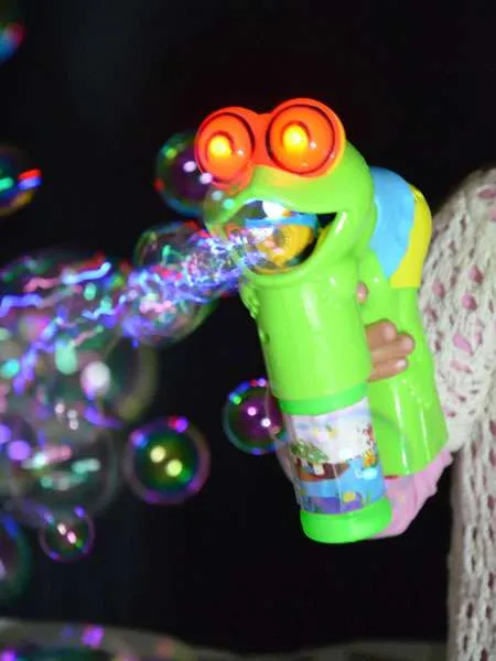 Drückt man den Abzug des Seifenblasen-Frosches, ertönt ein Lied. Außerdem leuchtet eine LED im Mund und die Augen des Frosches blinken. Die Seifenblasen erstrahlen in bunten Farben. Eine Kugel im Zulauf für die Flüssigkeit verhindert, dass die Seifenblasenflüssigkeit ausläuft, wenn Frogix gekippt werden sollte. Ca. 70 ml Seifenblasenflüssigkeit enthalten. Benötigt 3 x AA 1,5V Batterien (nicht im Lieferumfang enthalten, am besten hier gleich mitbestellen.)